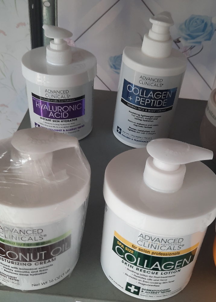 Advanced Clinicals with Collagen (454ml). Advanced Clinicals with Coconut oi (454ml)l. Advanced Clinicals with Collagen Peptide (444ml). Advanced Clinicals with Hyaluronic acid (454ml).