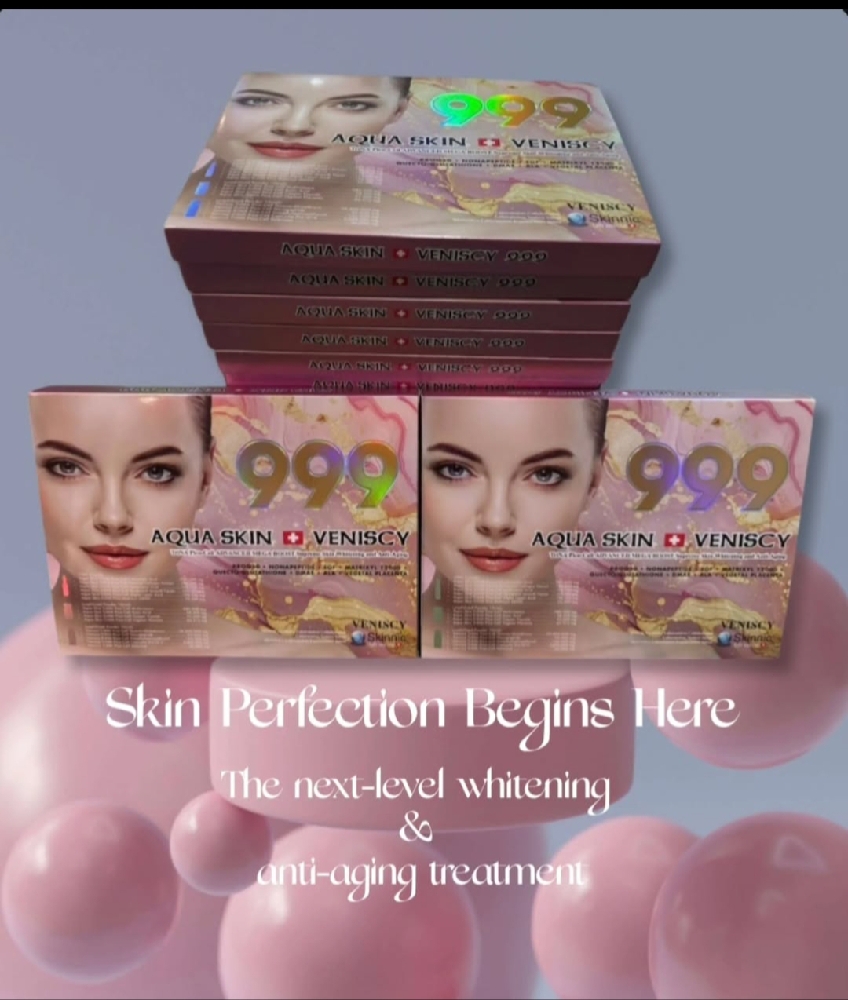 Aqua Skin Veniscy 999 is an advanced skin treatment that helps make your skin brighter, smoother, and younger-looking. With glutathione, vitamins, and natural extracts, it reduces dark spots, fights signs of aging, and improves skin health for a glowing look