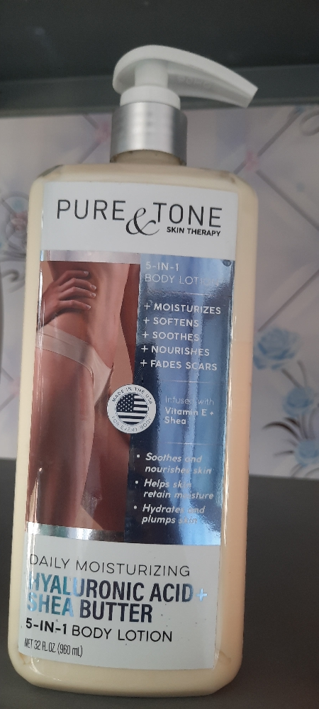 Pure and Tone body lotion with shea butter and hyaluronic acid to help repair damaged skin
