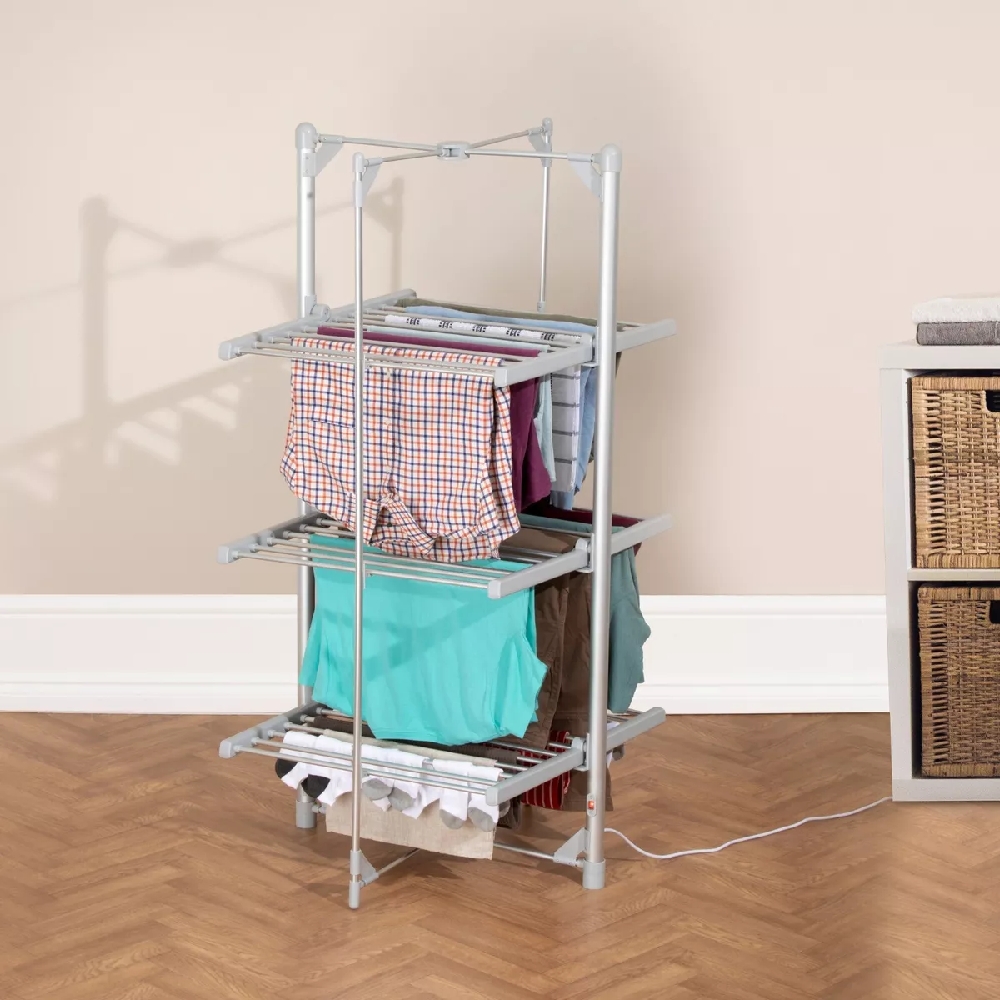 Daewoo 3-Tier Heated Clothes Airer, your ultimate solution for unpredictable weather and limited drying space. Ideal for apartments or homes without outdoor areas, this versatile drying rack is perfect for those damp, rainy days when outdoor drying isn’t an option. With a sturdy construction, it can easily support up to 30kg of laundry, providing around 20 meters of drying space across its three optimally spaced tiers. Choose between natural air drying or speed up the process with the efficient 300W heated function, which significantly outperforms traditional tumble dryers in energy efficiency. This means you can enjoy quick drying times while also saving on your energy bills. When not in use, the airer’s foldable design ensures it tucks away neatly, preserving your valuable living space. Product Features: