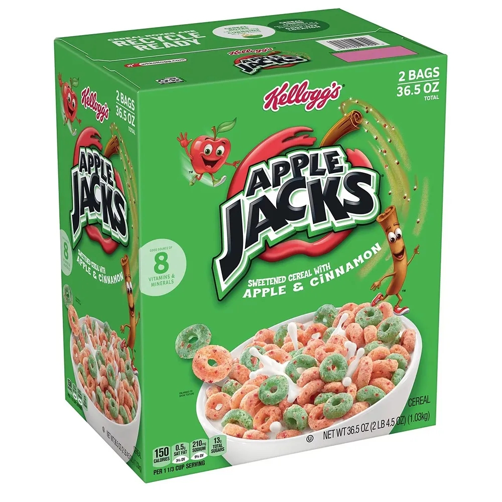 Start your day with Kellogg’s Apple Jacks breakfast cereal and the crunch of delicious O’s with the flavor of crisp apples and cinnamon. A low-fat breakfast cereal, Kellogg’s Apple Jacks is a good source of 8 vitamins and minerals. Not just for breakfast, Kellogg’s Apple Jacks is a tasty and nutritious addition to any meal or snack any time of the day. Enjoy as a snack at the office, an afternoon pick-me-up, a post-workout treat, and or a late-night bowlful of sweet, crunchy breakfast cereal.