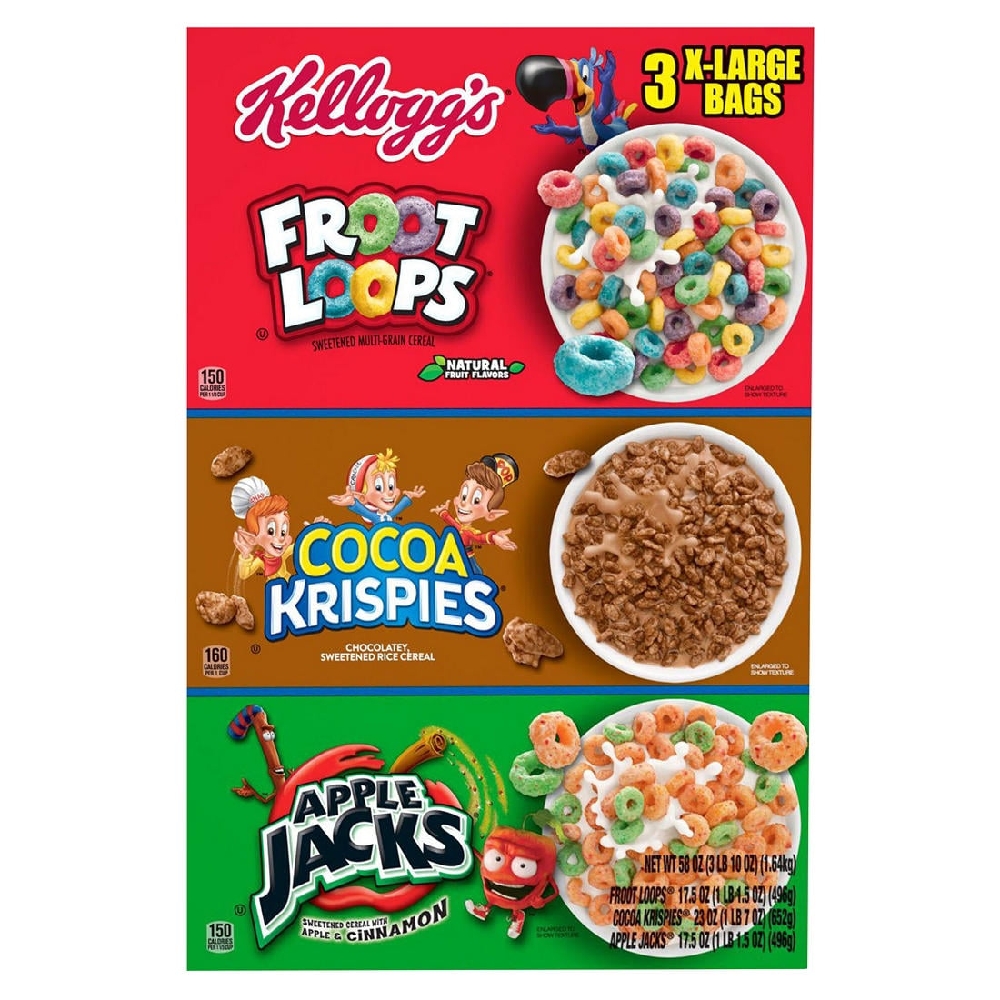 Kellogg’s Tri-Fun Cereal Assortment Pack, Froot Loops, Cocoa Krispies and Apple Jack Includes: -23 oz. of Cocoa Krispies -17.5 oz. of Froot Loops -17.5 oz. of Apple Jacks Product Features: -A delicious breakfast cereal variety pack -Family-favorite cereals perfect for kids and adults -Crunchy, sweetened, and crafted to help bring energy and smiles to busy mornings -Excellent source of at least 7 vitamins and minerals -3 low fat cereals you can enjoy with or without your favorite milk.