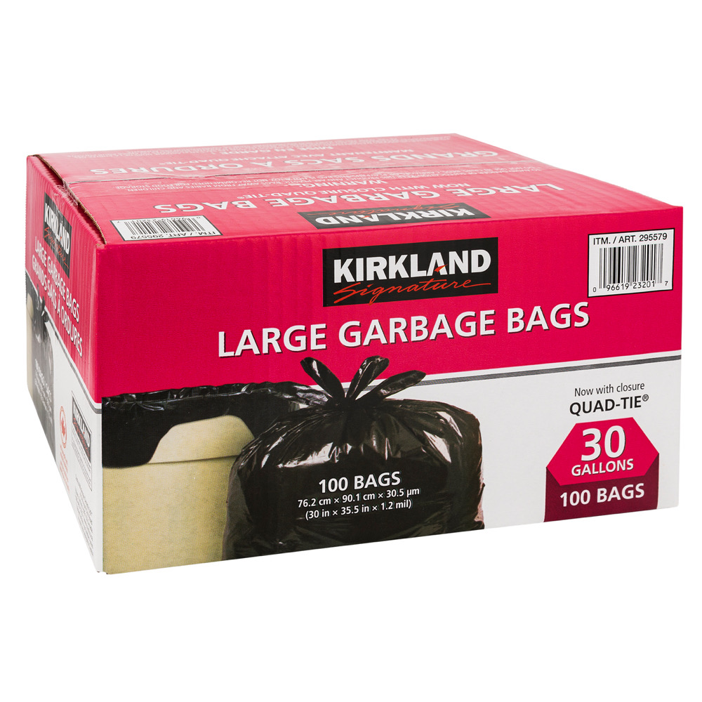 This product is a lot of 100 Kirkland Signature large trash bags, with dimensions of 76.2 x 90.1 cm and an thickness of 1.2 mm. Each bag has a four-tie closure. The trash bags are black in color and are sold in a package of 100, with each bag distributed individually. They are ideal for waste disposal.