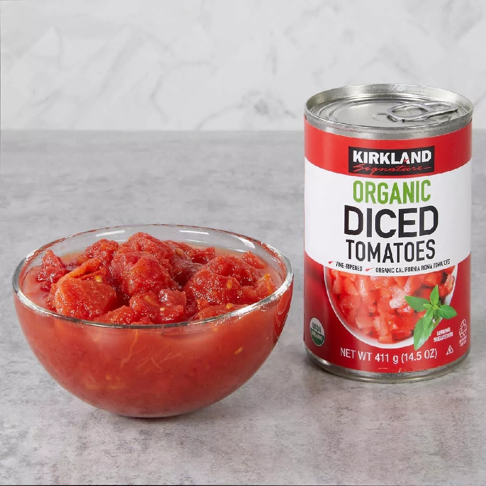 Kirkland Signature Organic Diced Tomatoes, 14.5 oz – a pantry essential for creating rich, flavorful dishes. These vine-ripened tomatoes are harvested at peak freshness and packed to preserve their natural taste and nutrients. Perfect for soups, sauces, chili, pasta, and more, these certified organic diced tomatoes bring farm-fresh quality to every meal. Free from artificial preservatives and additives, they offer a pure, wholesome ingredient for your favorite recipes.
