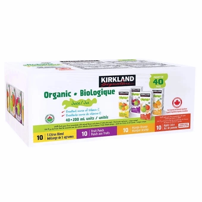This 40-pack of juice boxes contains 10 of each of four delicious flavours: Apple Juice, Citrus Blend, Fruit Punch, and Mango-Orange.