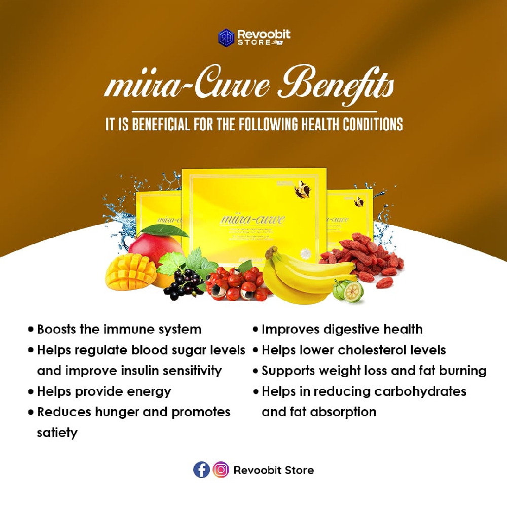 Miira-Curve is a delicious banana and chocolate flavoured weight-management supplement from Revoobit Immortals that is specially formulated with a powerful blend of natural ingredients designed to help burn excess fat, reduce unwanted appetite, control cravings, boost metabolism, support healthy digestion, increase daily energy, balance the body, and make healthy weight loss easier without extreme dieting or hunger, giving you a simple, enjoyable, and effective way to shape your body, maintain a slimmer figure, and feel lighter, healthier, and more confident every day.