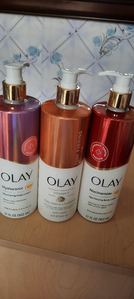 Olay body lotion replenishes the skin and locks in moisture. Olay Hyaluronic, Olay Niacinamide, Olay Vitamin E and B3. 502ml.