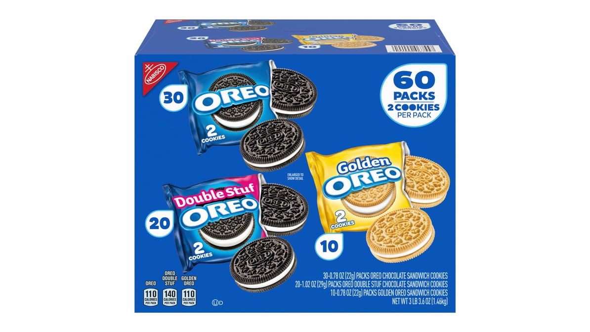 Nothing says love like enjoying your favorite cookie with your favorite person. Cheers! . Contains a variety of Oreo cookies including original, double-stuffed, and new flavors. 60 Count: Comes in a 60 count package for sharing or stocking up.